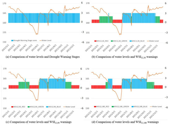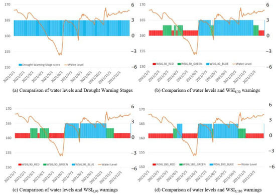 Figure 12 shows the comparison of the warning lights of the Drought Warning Stage for the short-term survival water index WSI6,j (j = 30, 60, 180). Figure 12a shows the comparison between the water level of the Drought Warning Stage of the Water Conservancy Department and the Feitsui Reservoir. In 2021, the water condition light of the Feitsui Reservoir was always condition blue. Figure 12b–d show the comparison of reservoir water levels with the water survival indices WSI6,30, WSI6,90, and WSI6,180 proposed in this study. It was found that the water level of the reservoir was very low during the period of 18 April 2021 to 5 June 2021, and the water survival index WSI6,j from this study had shown a condition red warning. However, the water supply monitoring index in the Drought Warning Stage of the Water Conservancy Department remained in condition blue. The results show that the short-term water survival index proposed in this study can actually present the effect of early warning.