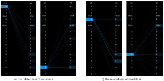 It presents the neuron views from four attention-heads of the second last layer of the distilled CodeBERT when the code sequence of toy examples shown in Figure 1a. It shows the captured long-range relatedness of variables a and b with other code tokens. The variables on the left are the target variables. Variables on the right which are connected by the lines from the target variable are the related variables attended by the attention-heads, showing that the model can correctly identify the variables that have relatedness. For example, Figure 2a shows that target variable a being highlighted is connected to a, and b by light blue lines, indicating that a is related to itself in a conditional expression and to b in an assignment statement of b = b + a;. In addition, variable a is also related to value NUM because NUM is assigned to variable b. This figure is generated using BertViz [49], which is a tool for visualizing attention mechanism in Transformer-based models.