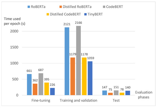 We use both the synthetic samples from the SARD project and the real-world samples from open-source projects for training Word2Vec, FastText, and GloVe. The PCMs and distilled PCMs have been pre-trained. In our experiments, we fine-tune the PCMs and their distilled counterparts on our dataset. For ELMo, RoBERTa, and distilled RoBERTa, they have been trained using a large language corpus. Therefore, we fine-tune them using the synthetic SARD dataset with 20,000 vulnerable and non-vulnerable samples, respectively. For CodeBERT and distilled CodeBERT, they have been pre-trained on both natural languages and programming languages. In particular, they have been trained on six different programming languages other than C. Hence, we also fine-tune them using the same amount of synthetic C samples. Compared with the size of datasets used for pre-training the PCMs, the synthetic SARD dataset used for fine-tuning is relatively small. We make sure that the fine-tuning process on PCMs to be completed in 12 h in our hardware settings. This is because, in practice, software development teams may not usually be equipped with high-end GPUs which can handle the training on a large amount of data. The pre-training and fine-tuning settings are listed in Table 3.