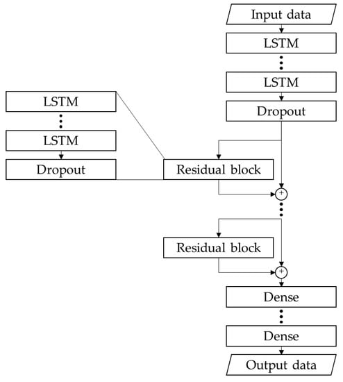 where denotes the output function of a residual block; denotes the residual function; and denotes the input vector. As shown in Figure 4, can be transformed into an equation that expresses the difference between of the residual block and , which is the same as the residual, the difference between the forecasted and observed values. Residual LSTM learns by approximating to zero to , for finding that best expresses . Therefore, residual LSTM can directly learn the residual through the residual-learning process. Second, residual LSTM can solve the vanishing-gradient problem that occurs with an increasing network depth.