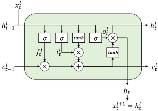 LSTM is a variant of recurrent neural network (RNN) with modifications to the cells. A general RNN is a model suitable for learning data with recursive characteristics of storing the result calculated for each time point in the internal memory of each cell. Equation (1) is calculated in the RNN prediction process: