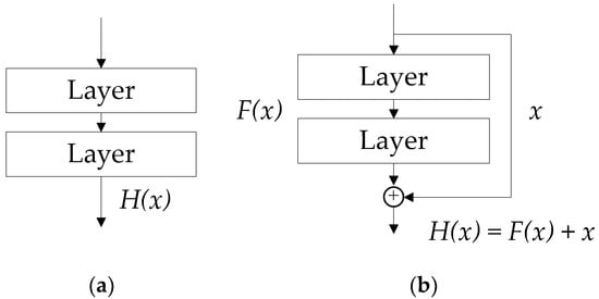 He et al., [34] presented a residual network (ResNet) as the first example of residual learning. Residual learning is performed through a residual block with a structure through which an input vector is shortcut-connected to an output layer. Figure 3a shows the structure of a normal deep learning network, while Figure 3b shows the structure of a deep learning network composed of residual blocks.