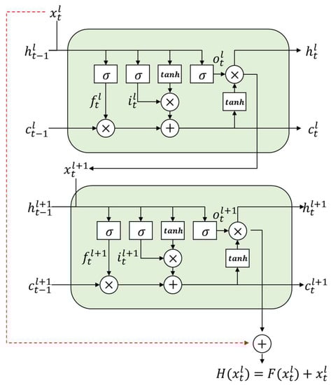 Prakash et al., [37] proposed residual LSTM, using the residual block structure introduced by He et al., [34], to resolve the accuracy degradation caused by the vanishing gradient of LSTM. The proposed model consists of two LSTM layers and a shortcut connection, as shown in Figure 4, connected by a red dotted line. Additionally, an upper LSTM input vector is connected to an output layer through a skip connection.