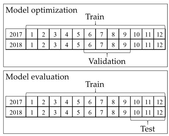 In this study, the hyperparameters of the proposed and benchmark models were optimized using the electricity-demand data. This study divided the data into three datasets to optimize hyper-parameters, as shown in Figure 5. The data for the 12 months of 2017 were used as the training set, the data from July to September 2018 were used as the verification set, and the data from October to December 2018 were used as the test set. Figure 5 shows that the test set was located after the validation and training sets to prevent any value from being used in the training of the proposed model [44].