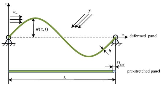 The structure we consider is a simply supported isotropic panel subjected to pre-stretch displacement and thermal loads in a supersonic aerodynamic airflow, as shown in Figure 1.
