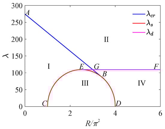 According to Wang et al. [] and Equations (30), (32), and (33), the parameter plane () is divided into five regions, as shown in Figure 3, where .