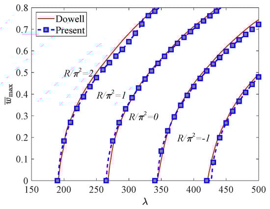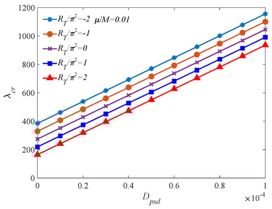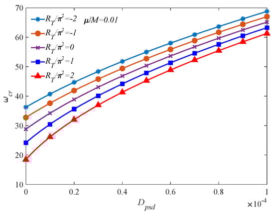 The influence of pre-stretch displacement on the critical dynamic pressure of the panel under different temperature elevations, where , is shown in Figure 7. In this case, , the critical dynamic pressure drops drastically with the temperature increase and increases sharply with the temperature decrease, where . This result agrees with that described by Xue and Mei [] using the finite element method. Under various temperature gradients, the critical dynamic pressure increases rapidly with the increase in the minimum of the pre-stretch displacement. When the pre-stretch displacement and , the pre-stretch strain can be computed as , and the critical dynamic pressure increases sharply by 380.78% compared to that at .