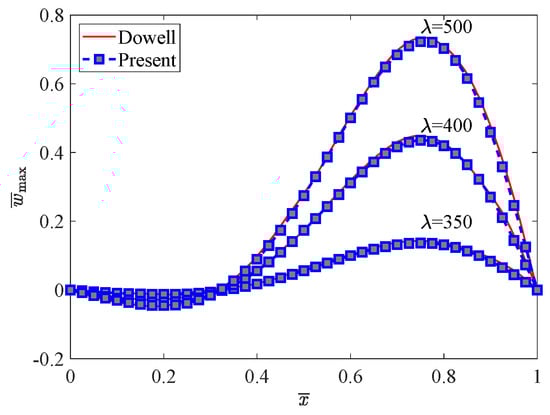 Dowell [] initially performed the nonlinear analysis of a two-dimensional flutter panel considering in-plane loads. The changes in aerodynamic deflection at different airflow pressures and the results of the flutter boundary vs. temperature are compared in Figure 4. It should be noted here that, for the thermal load , due to the temperature change and the in-plane compressive load in Xue and Mei [], the relation can be obtained. The panel deflection shapes shown in Figure 5 are in excellent agreement with the results from Dowell [], and the MATLAB code used in the numerical simulation is accurate.