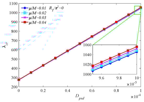 The influence of pre-stretch displacement on the critical dynamic pressure under different values is shown in Figure 6. As (the Mach number of the airflow ) increases, the critical dynamic pressure at the same pre-stretch displacement decreases slightly, and, overall, has a minor effect on the critical dynamic pressure. During the following analysis, takes the value of 0.01.