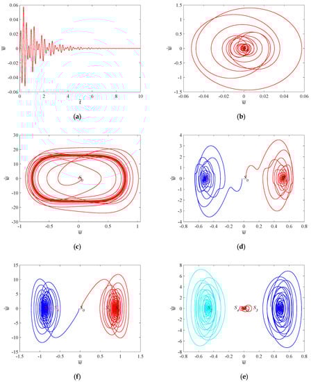 The eigenvalues of the Jacobi matrix for the equilibrium points of each region in Figure 3 are shown in Table 2. In region I, the system has only one equilibrium point and all four eigenvalues have negative real parts. Therefore, the equilibrium point is stable. The displacement response gradually converges to a straight line in the time history diagram, and the phase trajectory of the system converges to a stable point corresponding to the equilibrium point , as shown in Figure 9a,b. In region II, the system has only one equilibrium point , where one pair of four complex eigenvalues has negative real parts and the other pair has positive real parts. Therefore, the equilibrium point is unstable, and the phase trajectory of the system generates limit cycles near the point , as shown in Figure 9c.