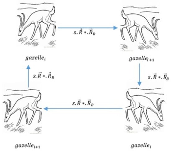 where denotes the locations of the top gazelle. The predator and gazelles are indeed regarded as search agents by the GOA. Since the gazelles are already running in unison for refuge by the time a predator is observed stalking them, the predator would have already searched the area when the gazelles flee. If the superior gazelle replaces the top gazelle, the elite will change after each iteration.