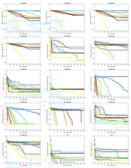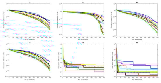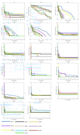 To find the best number of used candidate solutions of the proposed method, experiments were conducted as shown in Figure 5. The influence of the number of solutions (i.e., N) is examined on the classical test functions (23 benchmark functions). According to the literature, several numbers were taken to choose the population size; these numbers were 5, 10, 15, 20, 25, 30, 35, 40, 45, and 50, comparing the changes in the number of solution parameters throughout iterations (i.e., 500 iterations).