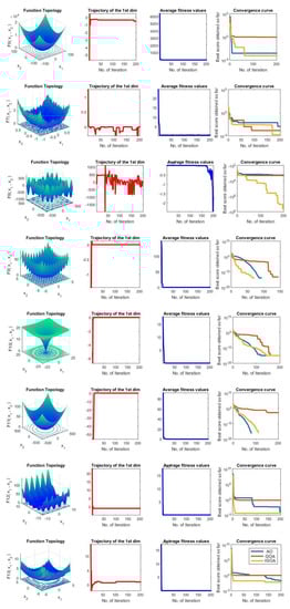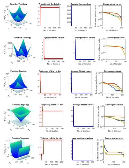 Deep investigations were conducted to show the performance of the proposed method compared to the original methods as given in Figure 6. In this Figure, in each row, four sub-figures are given: function topology, trajectory of the first dimension, average fitness values, and convergence curves of the tested methods.