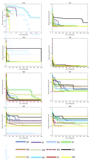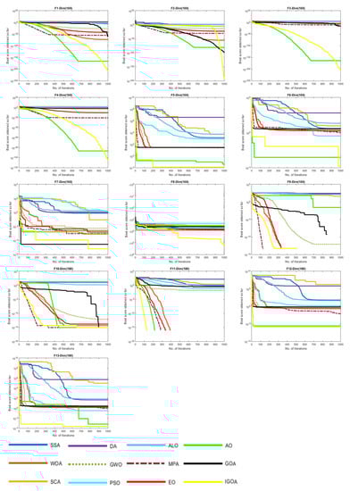 From the results of the F1–F13 classical test functions, one can see a clear significant gap among the results of the comparative algorithms, with superior solutions obtained from the proposed IGOA solution. As a result, the IGOA convergence speed is greatly improved. This observation proves the superior exploitative qualities of the IGOA. According to the obtained solution for multimodal and fixed dimensional multimodal functions, we conclude that IGOA achieved superior solutions in most cases (and in competitive solutions in some cases) according to the equilibrium between the explorative and exploitative capabilities, as well as a smooth change among the searching methods.