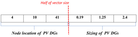 The discrete–continuous codification used here is illustrated in Figure 1. It can be seen that the location and power values (sizing) of the different PV sources in the DC grid are included in the same vector of size . The discrete variables are associated with the location problem, and the continuous variables are related to the sizing of the DGs. Note that in the same figure, the DGs located at node 4 have a nominal power of 0.19 Kw, while the PV sources installed at node 41 have a nominal power of 2.4 kW.