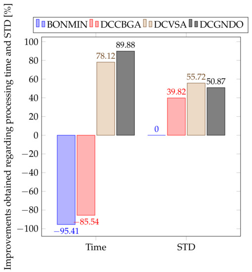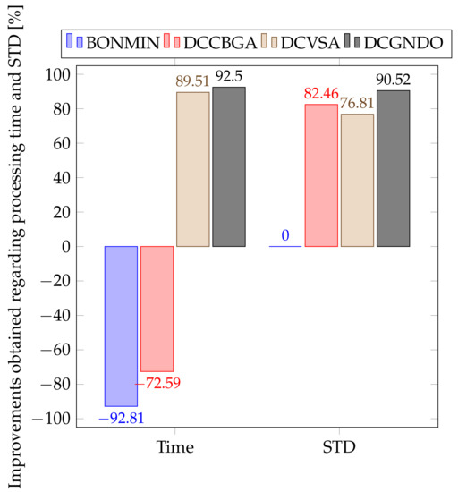 As for the processing times, the fastest method was the BONMIN solver, followed by the DCCBGA (Figure 5). These methods required 95.41% and 85.54% less time than the DCPPSO. In the 33-bus test system, the DCPPSO was in third place, with a reduction of 78.12% and 89.88% in processing times when compared to the DCVSA and DCGNDO. Despite these results, DCPSO had the best performance in terms of the solution. Figure 5 shows that the proposed methodology obtained the best results in terms of repeatability when compared to the solution methods based on sequential programming; it achieved an average standard deviation (STD) reduction of 48.80%. It is important to highlight that the BONMIN solver showed an STD of 0% since it belongs to the family of specialized software that guarantees the same solution each time that the algorithm is executed, although it has disadvantages in terms of purchase costs and implementation complexity [35,38].