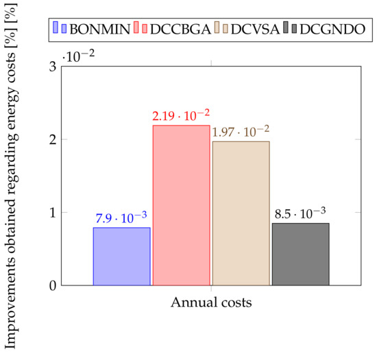 In the results presented in Table 3, it can be observed that all solution methodologies reduce the annual costs by 26.92% on average in comparison with the baseline case. However, the DCPPSO obtained the best results. Figure 4 illustrates the improvement achieved with this methodology, which obtained reductions of %, %, %, and 0 when compared to the BONMIN, DCCBGA, DCVSA, and DCGNDO techniques, respectively. Thus, the average annual cost reduction was %. It is possible to conclude that DCGNDO achieved the same results as DCPPSO in this test system.