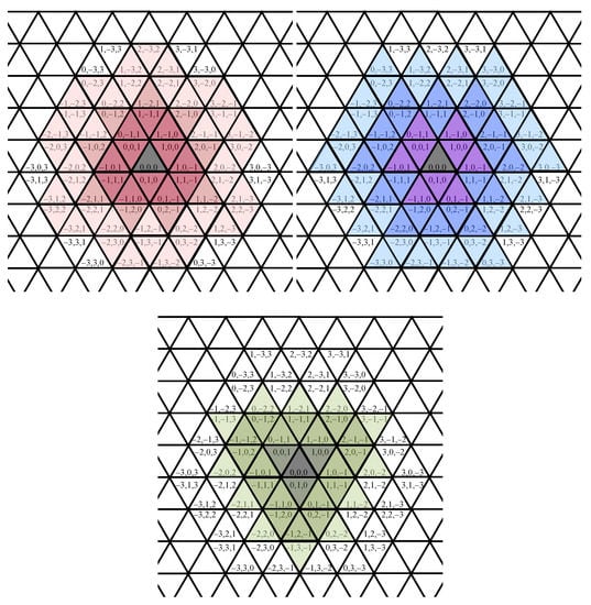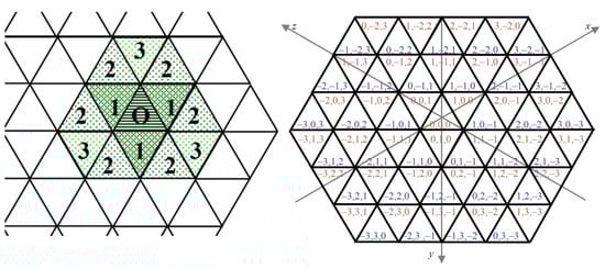 Figure 1 (right) shows a part of the grid with coordinate axes and coordinate triplets for the points of the grid (for details, we refer to [,,]). The coordinate system reflects the symmetry of the grid. The points are represented by trixels; however, throughout the paper, we usually refer to them as points.