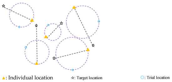 In a D-dimensional search space, for each individual, before generating its trial location, spherical boundaries are created in advance depending on the individual’s destination direction in every iteration. Here, the destination direction is the main axis of the spherical boundary, and the individual lies on the surface of the spherical boundary [47]. An example of a two-dimensional search space is depicted in Figure 1. The spherical boundary for each individual is drawn as “–”, the target location is drawn as “☆”, and each spherical boundary is generated using the axis obtained by the individual locations and the target locations. Trial solutions appear on the spherical boundary. Thus, in each iteration, the trial location for each individual is generated on the surface of the spherical boundary.