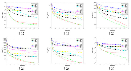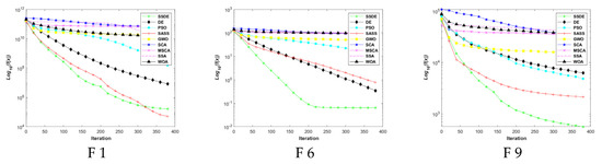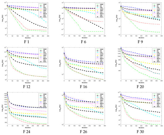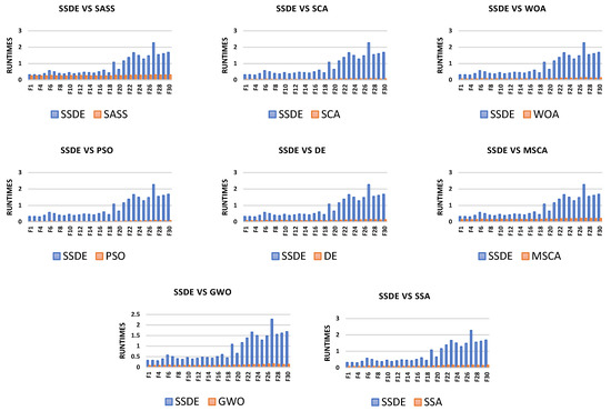 The running time of the SSDE and the algorithms for comparison on the 29 benchmark problems at 10 dimensions are shown in Figure 11. It is clear that the computation cost of the SSDE is higher than those of the other eight algorithms. Specifically, the average running time that the SSDE spends at 10 dimensions is 0.84, and the average running time of SASS, PSO, GWO, SCA, DE, SSA, WOA, and MSCA are 0.268, 0.04, 0.102, 0.052, 0.092, 0.111, 0.085, and 0.166, respectively. The reason for the longer running time of the SSDE is that its search process is divided into three stages, and the mutation and crossover strategies are applied at the end of the algorithm. However, although the SSDE takes more time than other algorithms, it can find optimal solutions.