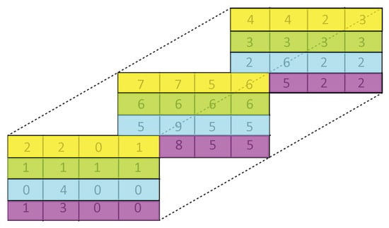 The main purpose of this example is to show the application of the criteria in three dimensions comprehensively, as was done in [5,45] for two-dimensional matrices. Let A be a 3D matrix in , and define it as follows: Figure 1 represents the 3D form of matrix