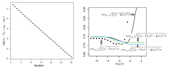 We demonstrate Theorem 1 and the double penalty model by considering regression with an L 1 penalty on the coefficients for f and an L 2 penalty on the coefficients for g. Thus, the form is the familiar elastic net [16], which we here re-characterize as a mix of LASSO regression (more interpretable because coefficients are sparse) and less-interpretable ridge regression. Although extremely fast elastic net algorithms have been developed [17], the conditions of Theorem 1 hold, and we illustrate using the diabetes dataset [18] with 442 observations and 64 predictors, including interactions. The glmnet package (v 4.0-2) [19] was used in successive LASSO and ridge steps, as in Algorithm 1. Figure 1 left panel shows the convergence of f m f ^ n + g m g ^ n (root mean squared error) for λ f = 0.032 , λ g = 1 (the results from a minimum grid search, although any pair will do). The right panel shows various root mean squared minima (RMSE and root mean squared variation) over { λ f , λ g } using 10-fold cross-validation. The results suggest choices of λ f , λ g that can nearly achieve the overall minimum RMSE, while placing the bulk of variation/explanatory variation on the more interpretable f.