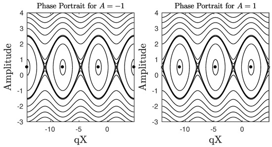Here, we formally consider the periodic external force to be as the one defined in Equation (7). In fact, if the external force is broad in comparison with the soliton length, the asymptotic theory is valid for any function f ( X ) —not only with vanishing ends. It works for periodic external forces with small values of q. It can be shown that the equilibrium points of this dynamical system are x = π / 2 q + k π , where k is an integer. Centers occur aligned with the crests of the external force while saddles are aligned with the troughs of the external force. Consequently, as we change the sign of A, the centers become saddles and vice-versa. It is worth to mention that centers and saddles represent solitary waves that remain steady for all times, a closed orbit represents a trapped solitary wave, and a non-closed orbit corresponds to a solitary wave that propagates without reversing its direction. Therefore, a phase-portrait of the dynamical system (15) qualitatively describes the behavior of the solitary wave and the external force interaction except for small corrections (order O ( ϵ ) ).