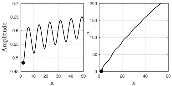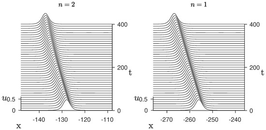 Firstly, we consider the simplest case—the saddle points. To this end, we run a large number of simulations and observe that the solitary waves move past the external force without changing their directions. However, reflection is observed as a solitary wave pass over multiple bumps. The reflection decreases as the frequency of the external force increases, which causes a change in the amplitude of the solitary waves. This typical behavior is illustrated in Figure 2 for different values of the parameter n. Details of the variations in the amplitude of the solitary wave for the case n = 120 are given in Figure 3. Notice that the amplitude of the solitary wave oscillates as it passes over each bump of the external force (see Figure 3 (left)). Additionally, the solitary wave speed keeps oscillating in time due to the interaction with the external force as displayed in Figure 3 (right). This dynamic is qualitatively represented by the non-closed orbits of the dynamical system (15), see Figure 1 (left). In fact, the fully numerical simulations and the dynamical system agree quantitatively well for small times. To see this, we recall that the asymptotic theory is obtained by truncating the terms of Equation (9) at order O ( ϵ ) which is the same order of the amplitude variations depicted in Figure 3 (left).