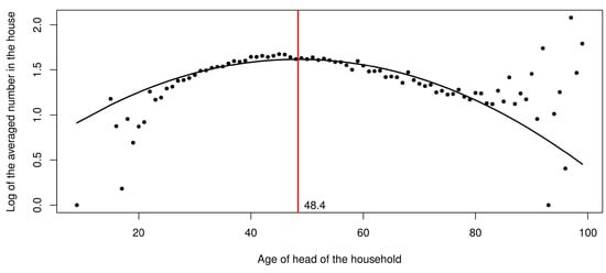 Moreover, the age of the head of the household that maximized the model is 48.4 years, which is indicated by the red line in Figure 2.