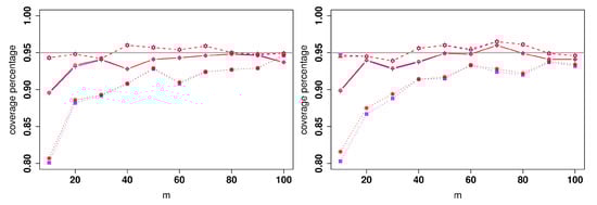 Let be generated from where and . The 95% coverage probabilities are plotted in Figure 4. In this case, the method in Hall et al. [6] is not applicable because . As shown in Figure 4, the convergence rates for estimates of and are faster than the ones for and . That may explain the differences in coverage percentage among them.