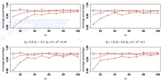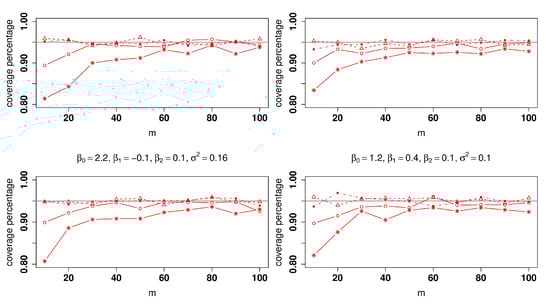 Let be generated from , where and . For each simulated sample, we obtain the 95% confidence interval for and record if the true is within the 95% confidence interval. Figure 3 shows the coverage proportion, where the nominal value is 0.95. Moreover, we have only one predictor, and thus the method in Hall et al. [6] can be applied as well. The results are also plotted in Figure 3 for comparison. We repeated the same procedure to obtain the coverage proportions for and , which are reported in Figure 3, respectively. As shown in Figure 3, for variance , both methods are comparable for larger variance . However, the proposed method is slightly better for small m.