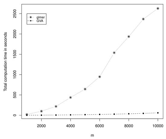- glmer is slow. Figure 7 compares the required computational times for different m. The computational time for glmer increases dramatically as the sample size m or n increases. For example, for , our proposed method was about 56-times faster than glmer.