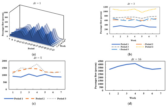 Passenger flow distribution. (a) Passenger flow distribution under time granularity , (b) Passenger flow distribution under time granularity , (c) Passenger flow distribution under time granularity , (d) Passenger flow distribution under time granularity .