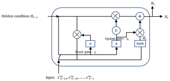 The Gated Recurrent Unit Neural Network (GRU) is an improved version of the Recurrent Neural Network. The GRU model has two gates, that is, a reset gate and an update gate. The reset gate controls the length of forgotten information, and the update gate can forget as well as select memory [47], as shown in Figure 4. The GRU model is composed of a simpler gate mechanism, which makes the calculation speed of learning and prediction faster.
