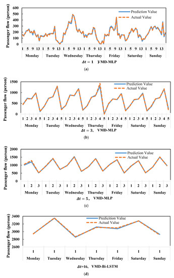 Based on the above parameter settings, the hybrid models VMD-MLP, VMD-GRU, and VMD-Bi-LSTM were used to predict the time-varying passenger flow of the Guangzhou–Zhuhai intercity high-speed railway. The comparison between the prediction value (the prediction value corresponding to the hybrid model with the smallest MAPE error was selected) and the actual value from Guangzhou South station to Zhongshan North station under different time granularities every day in a week is shown in Figure 7.