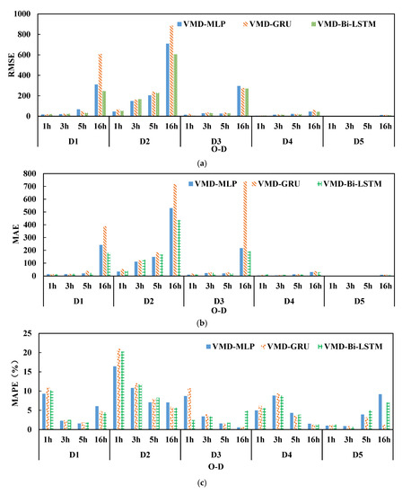 To measure the prediction performance, seven baselines (VMD-LSTM, VMD-ARIMA, MLP, GRU, Bi-LSTM, LSTM, and ARIMA) were adopted to compare with the proposed models, and the results for O-D D1 and are shown in Table 6. From Table 6, the prediction accuracy of the VMD-MLP, VMD-GRU, and VMD-Bi-LSTM models was obviously higher than the baselines and the hybrid models performed better than the single models. Hence, the proposed neural network-based hybrid models outperformed the existing models for predicting the time-varying passenger flow of an intercity high-speed railway.