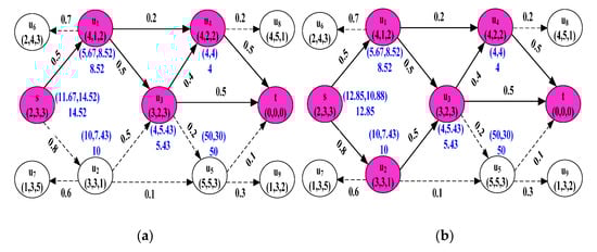 An anypath routing that satisfies formula (1) is called a feasible solution to the DMCAP problem, thus all feasible anypath routing in graph G are expressed as . However, a feasible solution to the DMCAP problem is computationally very complex, and the literature [] proves that it is a NP-hard problem.
