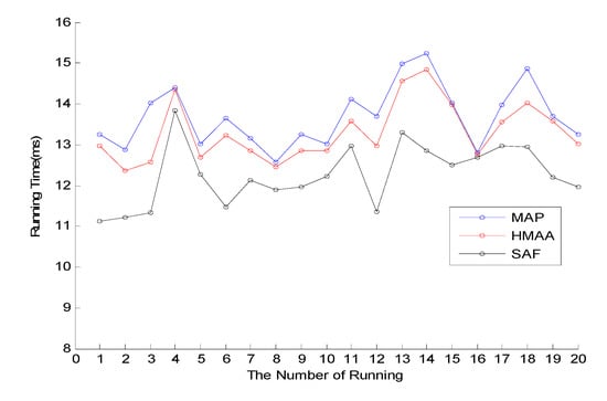 Running Time vs. the number of running for MAP, HMAA and SAF.