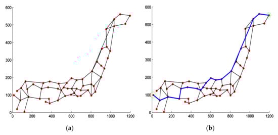 Figure 4a shows the static WMNs network structure diagrams of the simulation experiments. The NTT network has 57 nodes and 81 edges. Each link in these networks has three weights, which corresponds to Cost, Delay and Jitter. All of the parameters in these networks can be found at the following URL: http://code.google.com/p/efptas/downloads/list (accessed on 13 October 2022). All of the red points are denoted as nodes of the network, the black wires as the wireless links of WMNs in Figure 4a. The green circle denotes the source node S and the green star denotes the destination node T in Figure 4b, respectively. The final anypath , the blue path shown in Figure 4b, is obtained by running proposed HMAA algorithm. At the same time, we also ran two other algorithms on this real WMNs network. The final result is the same that the anypath path obtained by running SAF and MAP algorithms is also the blue path in Figure 4b. Therefore, we can draw a conclusion that in the real wireless multimedia network, the proposed HMAA algorithm is as effective as the existing SAF and MAP algorithms in finding the anypath path.