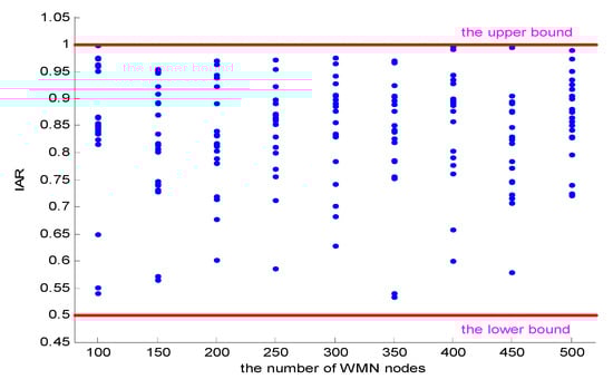 The following approximation rate IAR (ratio of optimal value to the sub-optimal value) [] is used to evaluate the performance of HMAA proposed in this paper. In other words, if the approximation rate IAR is equal to 1, it means that the optimal anypath is found, and if the approximation rate is less than 1, it means that the solution found is sub-optimal. Therefore, the approximation rate IAR indicates the quality of the solution found by HMAA. As we know that finding the optimal solution to MCOAP is NP-hard, is replaced by the solution obtained by the intelligent algorithm proposed in []. Therefore, IAR is obtained by comparing the value calculated by HMAA with that by []. The network with different nodes is calculated 20 times, respectively, thus the approximation rate IAR (blue dot) is recorded in Figure 6.