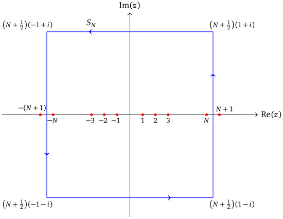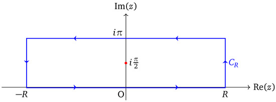 The function (6) has only one pole inside the region bounded by the rectangular contour at . Hence, according to the consequence of Cauchy’s residue theorem [44,45,46], we can calculate that the contour integral over is given by