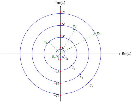 The poles of , i.e., , , are shown as red points along the imaginary axis. The plot also shows the several concentric blue circles with positive orientation and radii that do not intersect these poles.