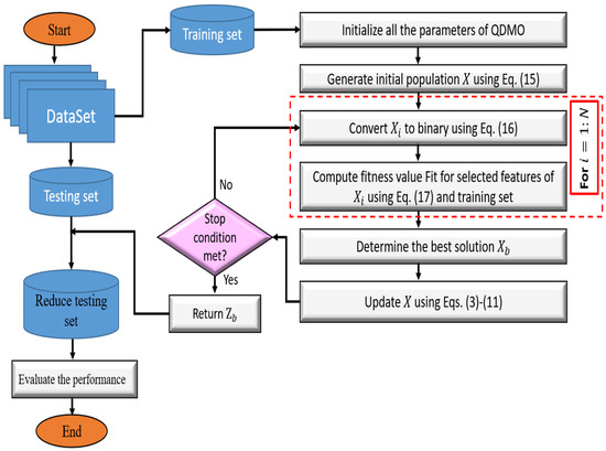 In order to improve the ability to strike a better balance between the exploration and exploitation of DMA while looking for a workable solution, QBO is used. The training and testing sets of the newly created FS method, DMOAQ, are composed of 70% and 30% of the total data, respectively. Then, using the training samples, the fitness values for each population are calculated. After that, the best agent is allocated, which has the lowest fitness value. The solutions are modified using the operators of DMA during the exploitation phase. Updating of each individual continues until the stop criteria are met.