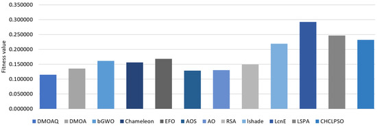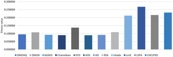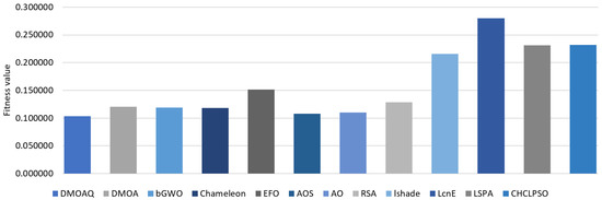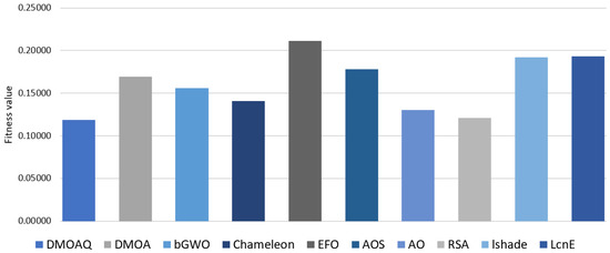 Moreover, the best results of the fitness function values are recorded in Table 5. This table indicates that the proposed DMOAQ obtained the minimum fitness values in 8 out of 18 datasets. It was ranked first with obtaining the best Min results in Exactly, KrvskpEW, M-of-n, Tic-tac-toe3, Vote, WaveformEW, WineEW, and Zoo. The Chameleon showed the second-best results and obtained the best values in 6 out of 18 datasets. Both bGWO, AOS, and AO were ranked third, fourth, and fifth, respectively. The worst performances were shown by LSHADE-cnEpSin, LSHADE, and LSHADE-SPACMA. Figure 4 illustrates the minimum average of the fitness functions for all datasets for this measure.