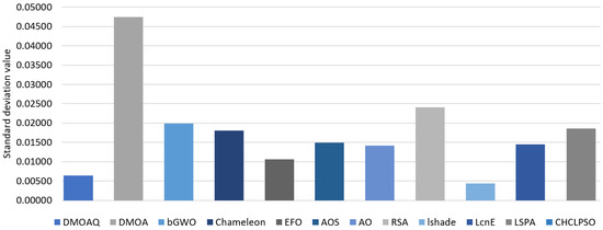 Table 4 presents the standard deviation values for the algorithms. The proposed DMOAQ showed acceptable standard deviation values, whereas, the CHCLPSO showed the smallest Std values followed by LSHADE and LSHADE-SPACMA. The worst results were shown by the bGWO, Chameleon, and LSHADE-SPACMA. The rest of the algorithms showed similar results to some extent. Figure 3 illustrates the standard deviation average of the fitness functions for all datasets for this measure.