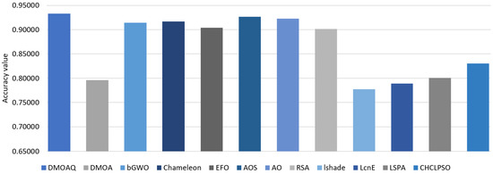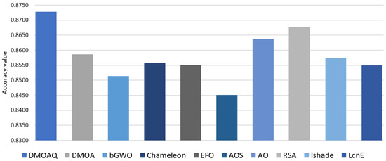 Furthermore, the results of the classification accuracy results are presented in Table 11. The DMOAQ method, as in this table, obtained the highest accuracy results in 3 out of 8 datasets, namely: sensors, Movm, and UCI datasets, whereas, it showed the same results in two datasets with RSA in Trajectory and EFO in C6. The second-best algorithm was the RSA. The AO came in the third rank, followed by DMOA, LSHADE, and Chameleon, respectively. The worst accuracy results were recorded by the AOS. Figure 9 illustrates the classification accuracy average for all datasets for this measure.
