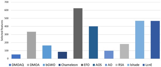 Moreover, the selected feature numbers by all methods are recorded in Table 10. In this measure, the best method is the one that can determine the relevant features with the highest accuracy value. As shown in Table 10, the DMOAQ method selected the smallest features amount and considered the best method; in detail, it obtained the lowest features in 7 out of 8 datasets. The Chameleon was the second-best algorithm, followed by AO, bGWO, RSA, and DMOA. Figure 8 shows the ratio of the selected features for all datasets for this measure.