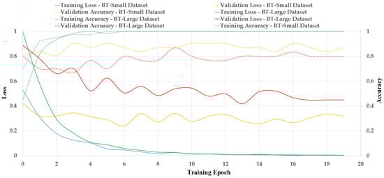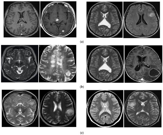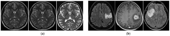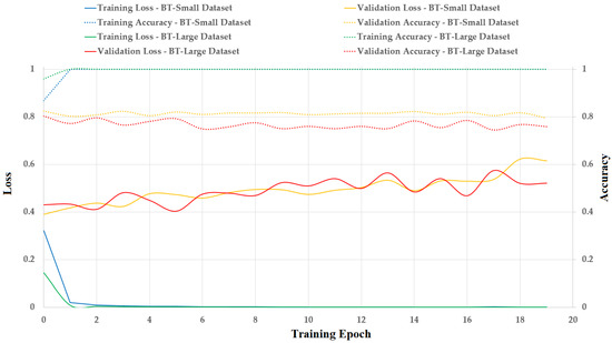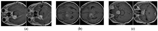 Figure 8. This dataset is different from the BT-Small dataset, which contains images of two categories of tumor (with tumor region) and non-tumor (without any tumor region) images. As the BT-Small dataset contains images with and without tumors, the difference between the images in the two categories in the BT-Small dataset is high. Therefore, we can easily distinguish between tumor and non-tumor images. However, the difference between images among categories in the BT-Large dataset was low because all images in the BT-Large dataset contained tumors. In addition, the BT-Small dataset contained two image classes (categories), whereas the BT-Large dataset contained three image classes (meningioma, glioma, and pituitary). Therefore, classifying images into a large number of predefined categories using a small amount of training data is also a more difficult problem than classifying images into a small number of predefined categories. Therefore, the classification performance of the BT-Small dataset was much better than that of the BT-Large dataset, as shown in