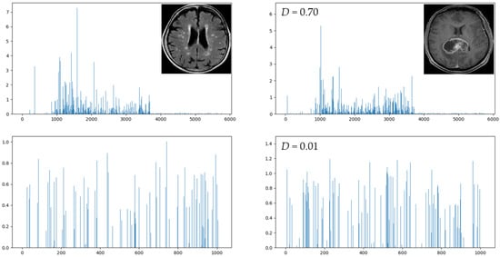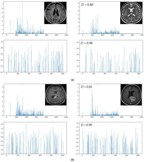 Figure 15b shows the case of two tumor input images. Without the use of the FS network, the similarity of two input images is approximately 0.81 (