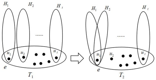 Let () be an edge of a connected hypertree . Assume that and are the only two non-pendant vertices in e. In addition, and are two sub-hypertrees of such that and for . Let be the hypertree obtained from by moving the sub-hypertree from to (as depicted in Figure 2). Then, .
